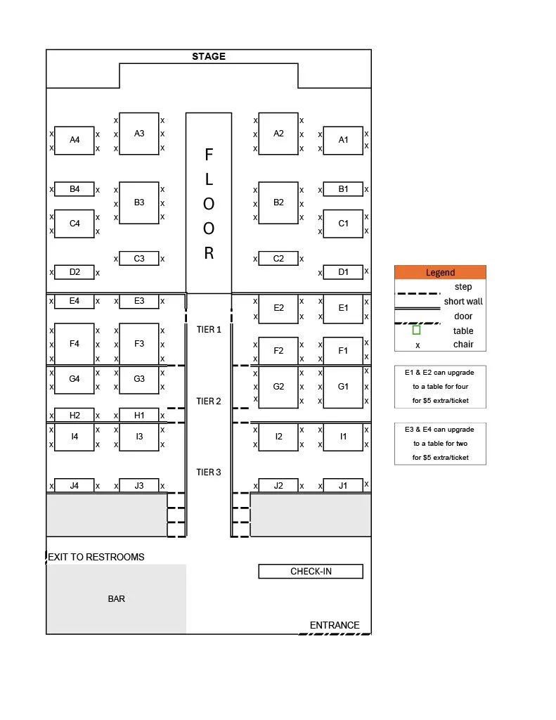 *We do offer two tables against the front of the first tier reserved for a table of two or four but this is an upgrade at $5/each per person & only if available. First come first serve in making reservations.